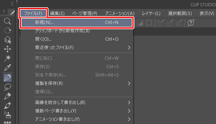 CLIP STUDIO PAINT画面上部の左上にある「ファイル」を押すと下にズラっとメニューが現れます。