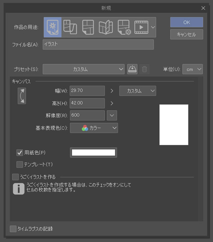 クリスタのおすすめのキャンバスサイズと解像度(dpi)については、以下の記事でも詳しく解説しています。