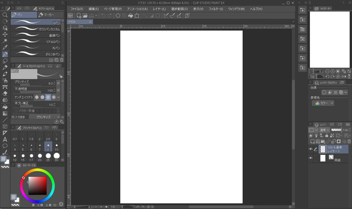 新規キャンバスは「レイヤー」「用紙」という2つが表示された状態で展開します。