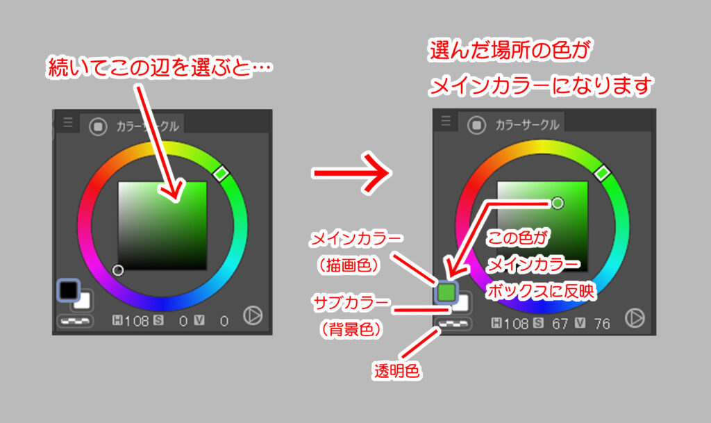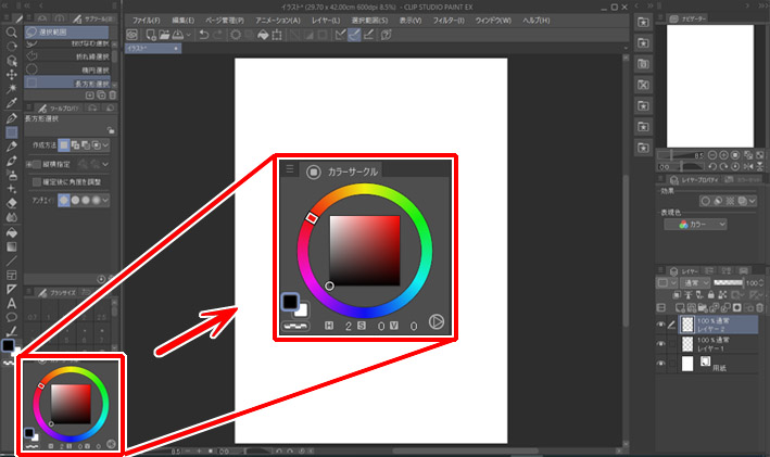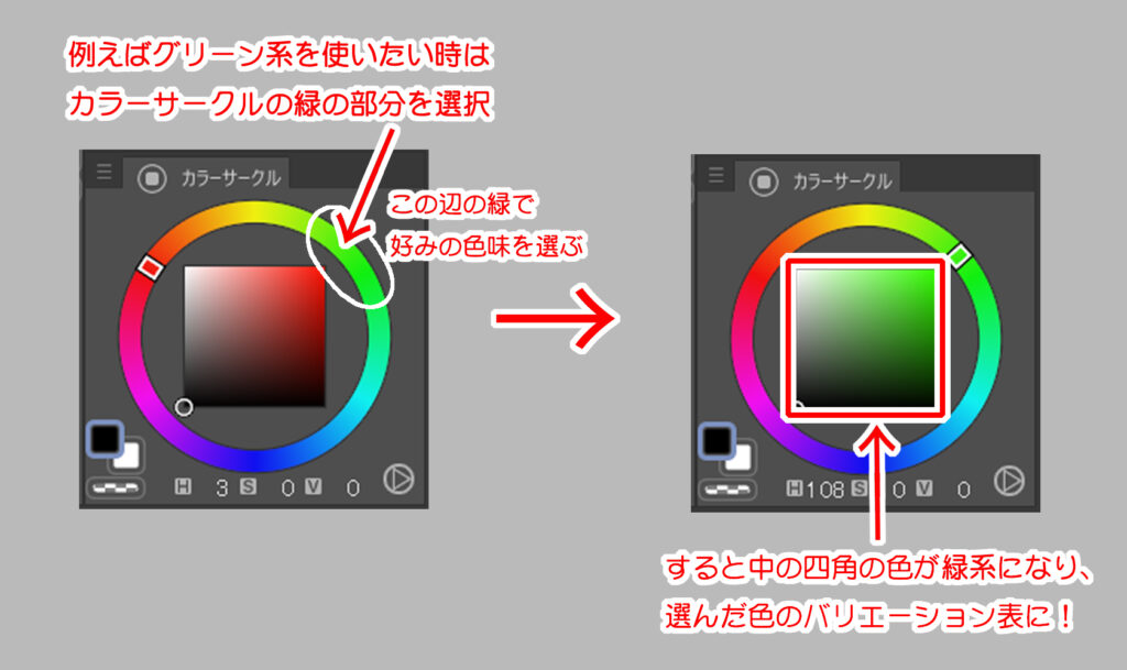 この虹のような色の輪(カラーサークル)の中から使いたい色を選ぶと、サークルの中にある四角の色が変わり、その色の彩度と明度を選べるようになります。こんな感じ。
