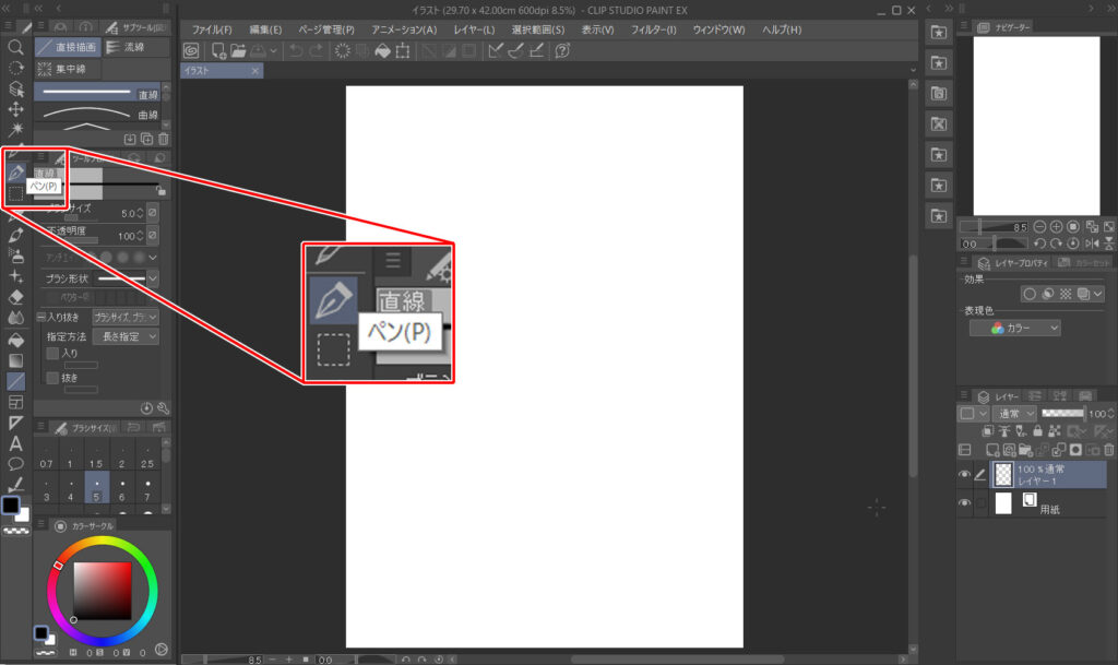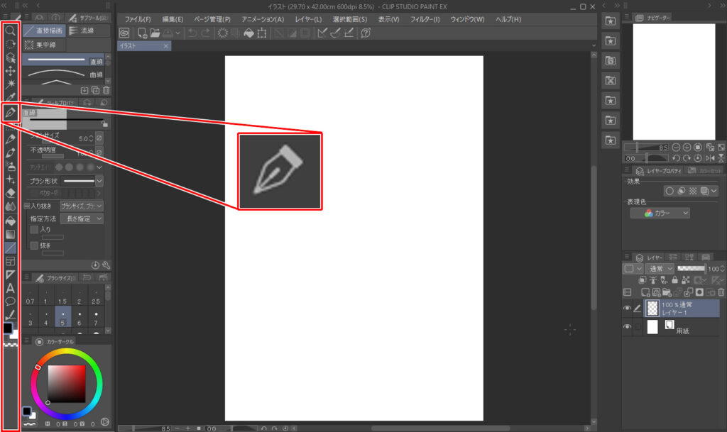 ペンツールは文字通りペンとして使えるツールで、これで線を引きます。左端に縦にアイコンが並んでるのがツールパレット。そしてペンツールのアイコンは万年筆の先のような絵柄です。
