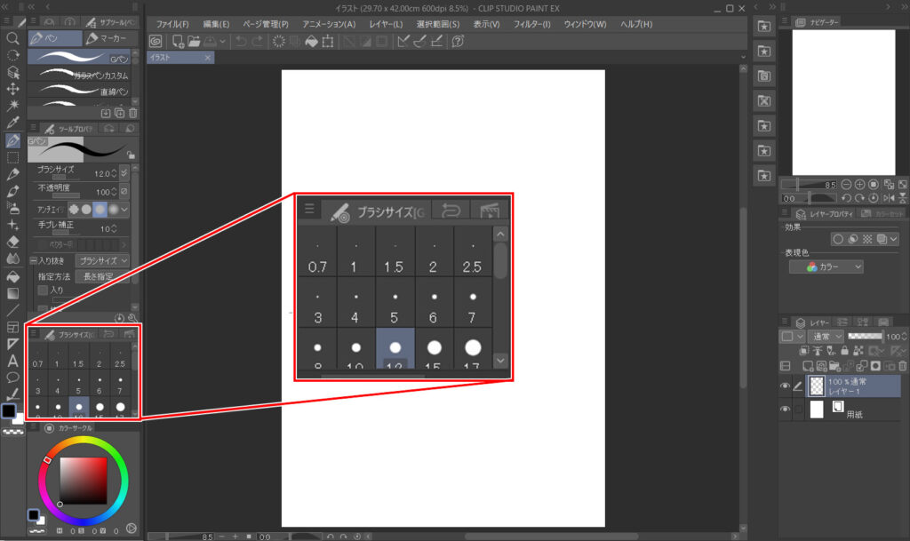 また、ツールプロパティパレットにブラシサイズを調整できるところがあるので、これも使いやすい太さに調整しましょう。