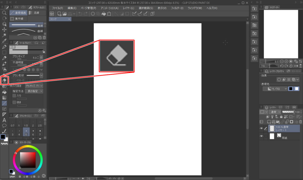 続いて消しゴムツール。こちらも文字通り 消しゴムとして使うツールです。