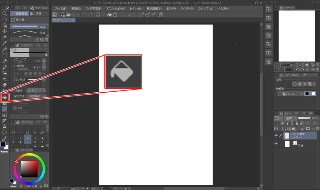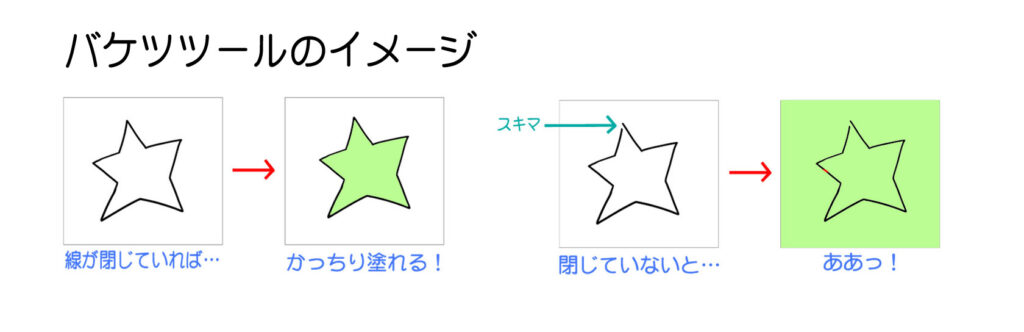 着色には主にバケツツールを使いますが、バケツツールはその名の通り「色を流し込む」ツールなので、線が閉じた、つまり囲われた状態の箇所に着色されるという特徴があります。線が閉じてないと余計なところにまで色が漏れてしまうので、それを意識して使う必要があります。