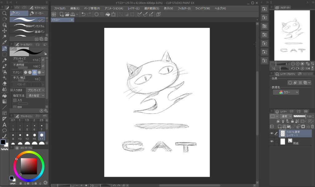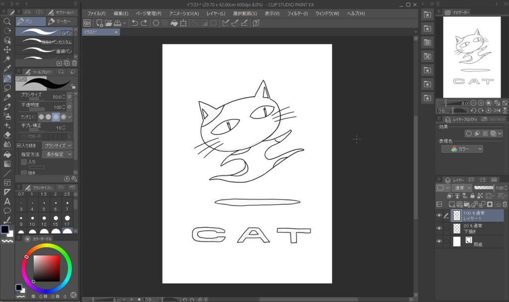 まず下書き用のラスターレイヤーをひとつ作って、ペンツールで下描きを描きます。下描きレイヤーを設定する方法は別にあるのですが、ここではあえて簡単な方法で行きます。