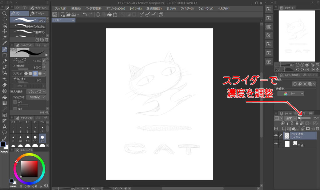 描き終わったら、下描きレイヤーの透明度を適当な濃度に薄めます(自分の見やすい濃度にすれば何%でもOK)。