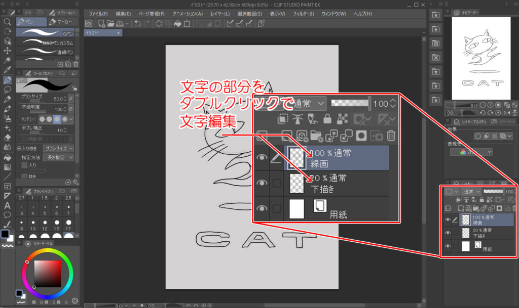 これはやってもやらなくてもどちらでもいいのですが、レイヤー名はレイヤーパレットの任意のレイヤーをダブルクリックすれば文字編集できるので、ここでは下描きレイヤーと清書レイヤーを間違えないよう区別するため文字編集しておきます。