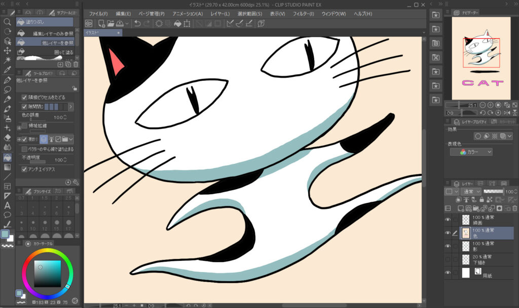続いて影の部分を塗ります。あ、猫の下にある影ではなくて、顔の影や手足の影部分のことです。