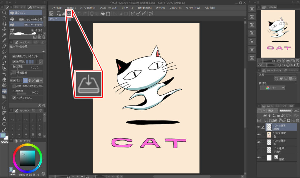 トラブル時に傷口を少しでも小さくするために、下描き途中で保存、下描き終了で保存、清書途中で保存、のように保存はこまめに行うクセをつけましょう。10分ごとに保存なんていうのでもOKです、自分のやりやすい方法で定期的な保存をしてください。