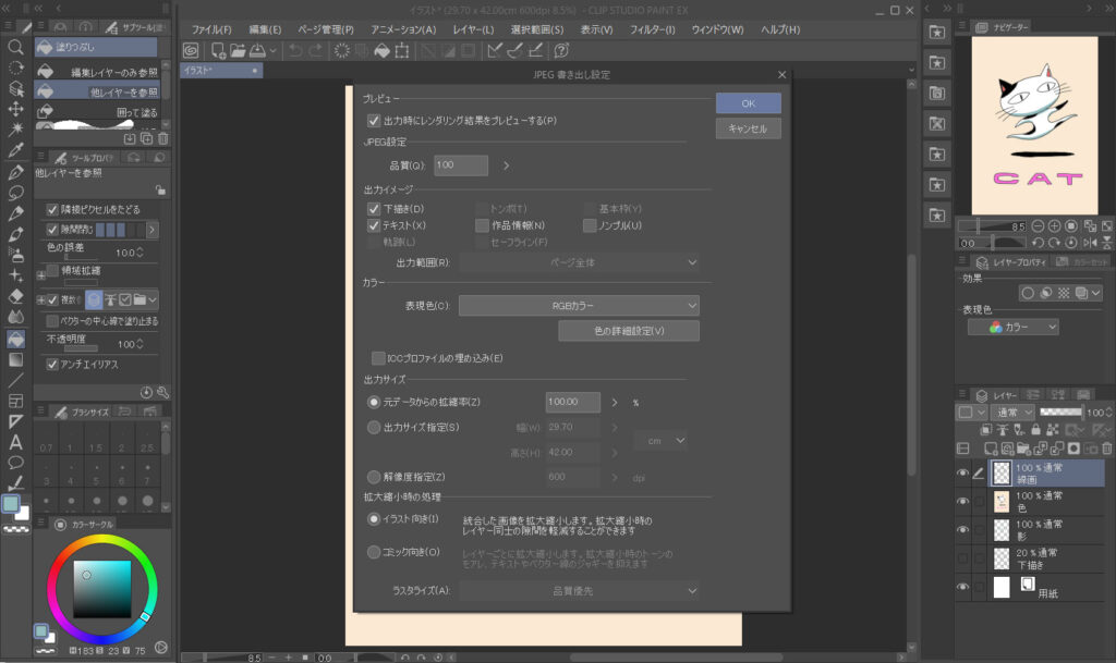 絵が完成したらネットにアップロードできる状態にする、もしくは印刷などに対応できる形式にする必要があります。
