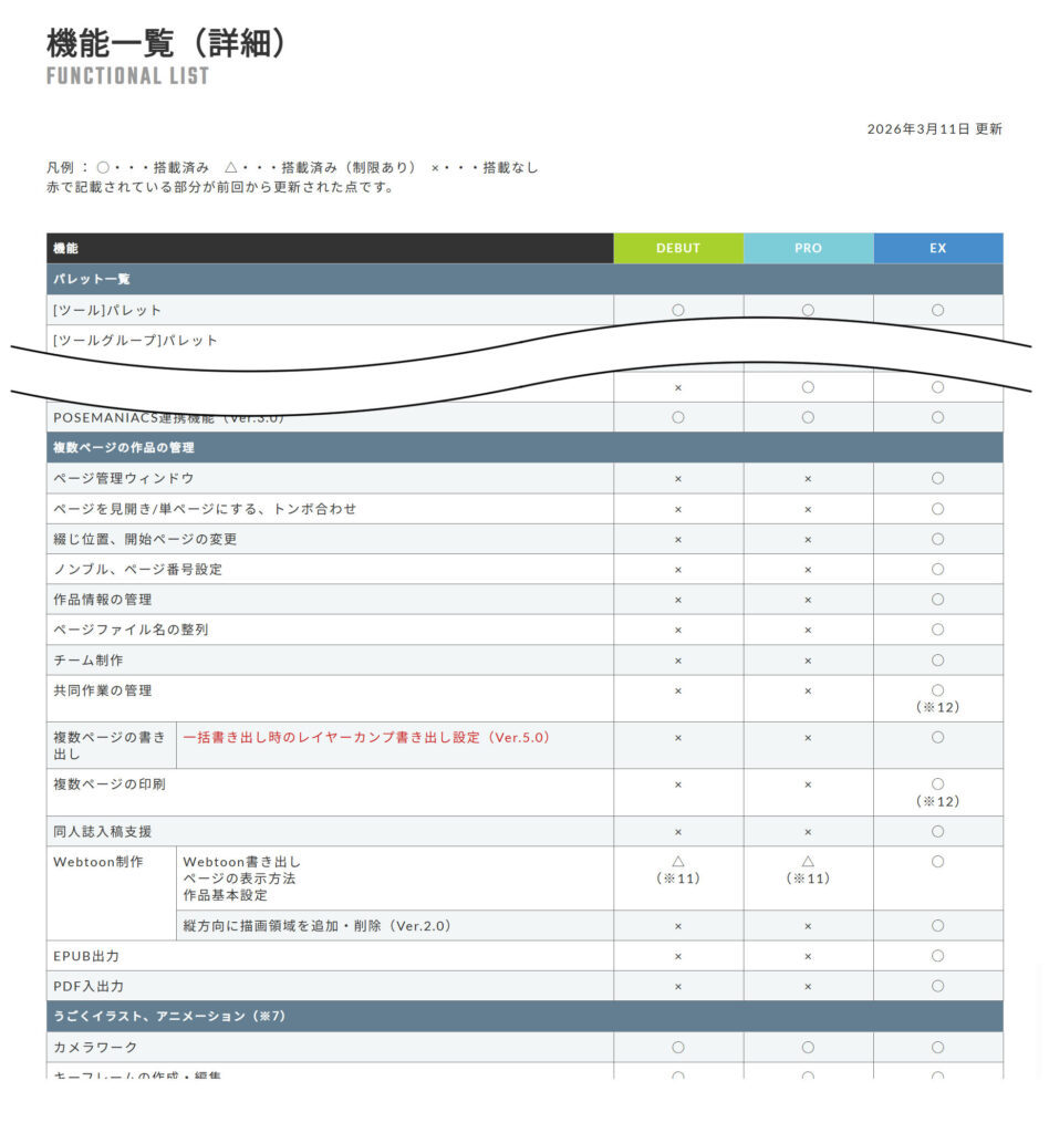 公式ページの比較表をみるとお分かりのように、ほとんどの項目でPROとEXには差がありませんが、複数ページの作品管理の項目ではPROにことごとくバツがついています。